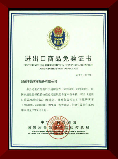 关于批准宇通客车获得"进出口商品免验证书"资格的文件