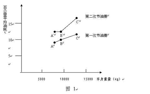 客车自重与油耗有着十分密切的关系,车身越重油耗越大,这是不争的事实,因此,在保证安全和乘坐舒适的前提下,轻量化、紧凑化设计客车车身是各客车生产厂家追求的目标,事实也证明这一点。根据我集团公司两次节油赛的油耗数据与参赛车辆自重的关系,绘出如下曲线图。