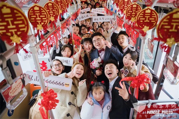“我们一直想办一场与众不同的婚礼,当得知有‘520 婚礼巴士’时,就觉得这简直是为我们量身打造的。”在长沙宁乡,“520”巴士专线成为了新人罗涛和邹玲的婚礼舞台。婚礼当天,这辆中车新能源公交车被精心装扮成了一个“移动的婚礼殿堂”。大红色的车身点缀着鲜花和喜字,车厢内环绕着气球和彩带,布置得温馨又浪漫。“我们还带了一个车载音响,一路上大家欢歌笑语,氛围特别热闹、甜蜜。” 新娘邹玲激动地说,“拍照也非常出片!”
