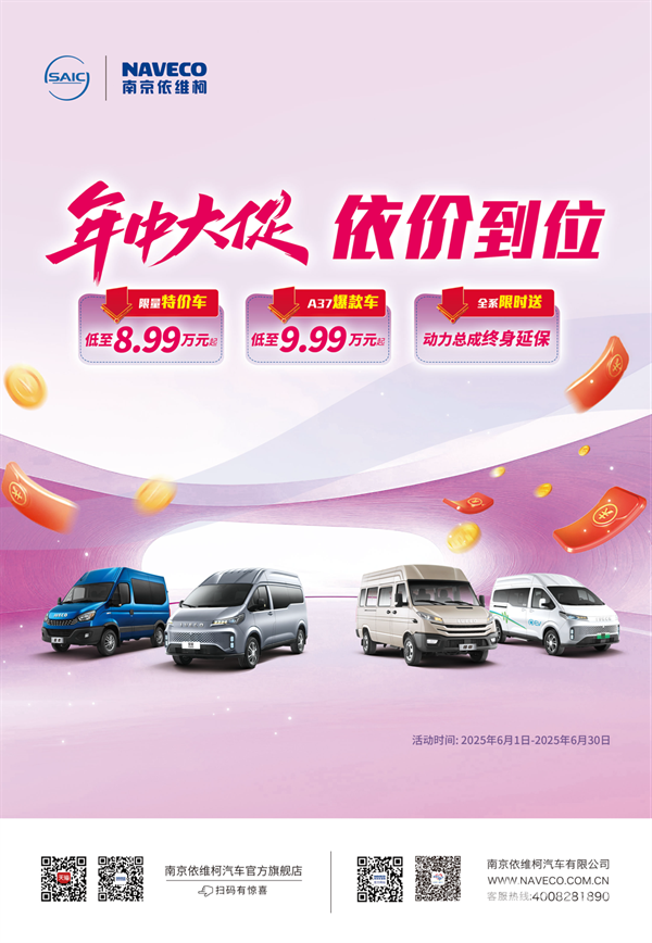 年中大促,依价到位!6月1日-30日,依维柯超值福利强势登场,为你解锁购车新体验,限量特价车低至8.99万元起,A37爆款车低至9.99万元起,更有全系限时送动力总成终身保修等诸多福利。活动限时开启,好车不等人,优惠稍纵即逝!速至南京依维柯授权经销商处咨询,锁定属于你的专属福利!