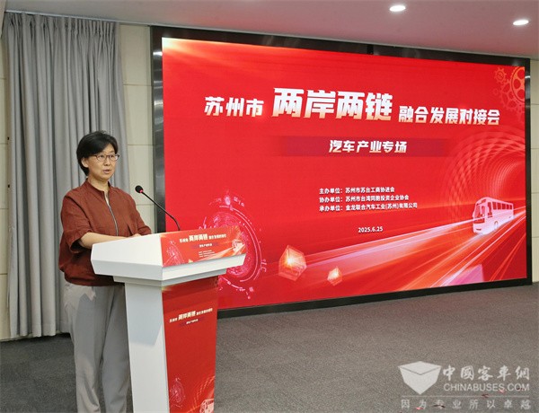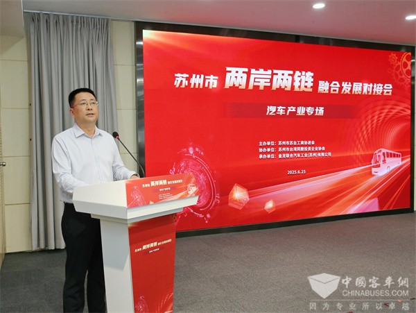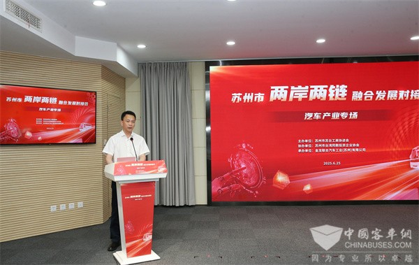 2025年6月25日,苏州市首届"两岸两链"融合发展对接会在苏州金龙成功举办。江苏省台办主任练月琴,苏州市副市长毛伟出席活动并讲话。会议吸引了150余家两岸企业参与,重点围绕汽车产业链合作展开深入交流,旨在促进两岸企业在汽车供应链领域的深度协作。苏州市台办主任吴敬宇、苏州创元投资发展(集团)有限公司党委书记、董事长沈伟民出席活动并为两岸两链融合发展对接会启动揭幕,苏州金龙党委书记、董事长陈笃廉作为承办方代表出席对接会并致欢迎辞。