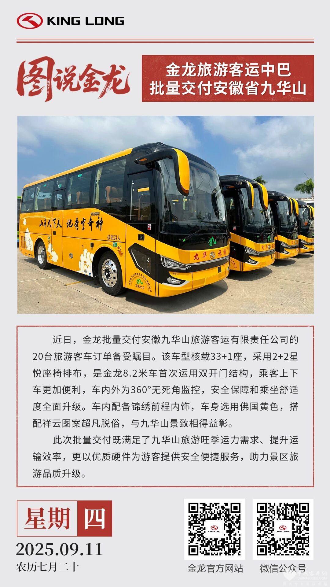 近日,金龙批量交付安徽九华山旅游客运有限责任公司的20台旅游客车订单备受瞩目。