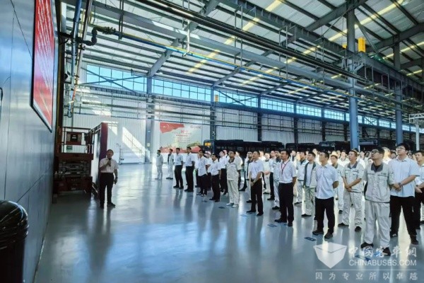 在激昂的旋律中,全体干部职工注视着五星红旗与中车司旗冉冉升起,爱国情怀与使命责任感在每个人心中激荡。