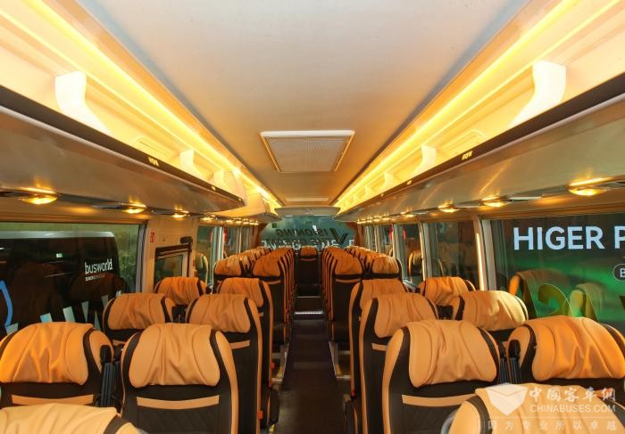 以此次展出的高端旅游巴士V12EPro为例,其专门为冰岛客户打造,标准续航500公里;电池箱配备了氮气保护装置及电池专用热管理空调;12.4米车长与3.85米外高带来宽绰空间,过道两排座椅可左右横移,进一步扩大活动空间;通过布置优化,首次在12米的纯电客车上突破10m³的超大行李舱空间;车辆运营整体噪音比欧标低2分贝;豪华内饰包括高级地毯、琥珀色车内氛围灯、高铁式下拉窗帘及人体工学座椅,每座标配头枕、脚踏和娱乐触控屏,让乘客尽享看电影、听音乐、玩游戏等娱乐功能。值得一提的是,这款车型还充分考虑到乘客的多样化需求,中门台阶下内置轮椅升降机,轮椅区可增加活动平台,可拆卸加装座椅,兼顾无障碍出行与客户运营灵活性。