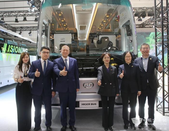 金龙汽车集团董事长陈锋(左三)等集团领导莅临发布会并在海格新V系客车前合影