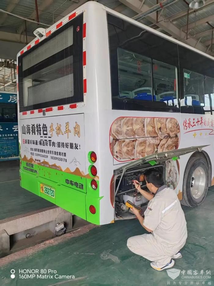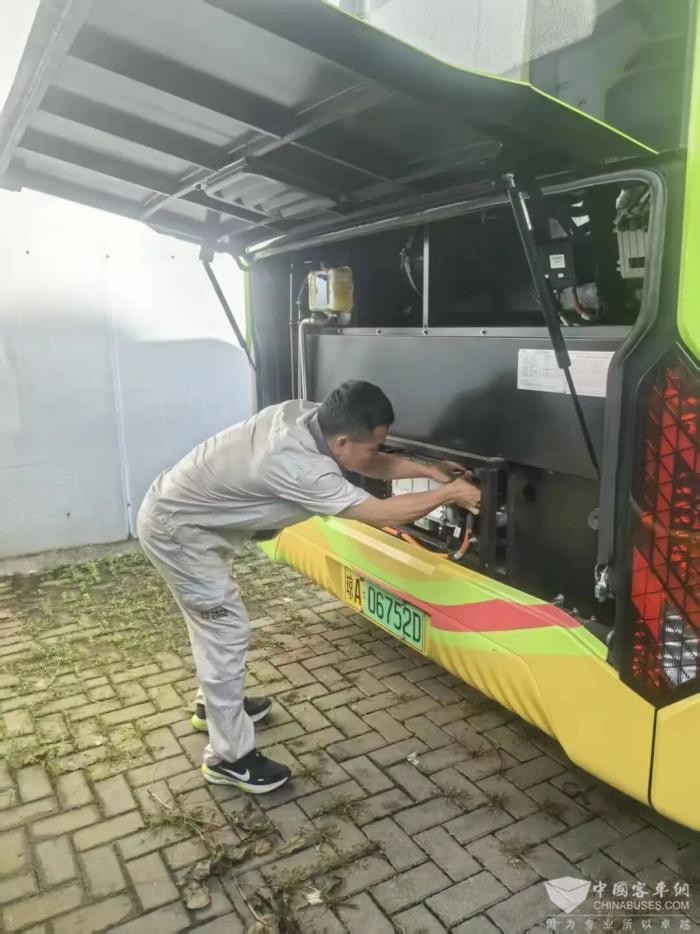 李观顺顶着高温湿热天气,坚守在车辆运营一线,细致检查电池与电控系统,确保新能源车辆在特殊气候下的稳定运行,守护旅客的每一段旅程。