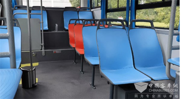 车厢内配备17座新能源车专用公交座椅,色彩明快、乘坐舒适。特别在中门对侧设置4张爱心座,优先保障特殊乘客需求,将人文关怀融入出行细节。
