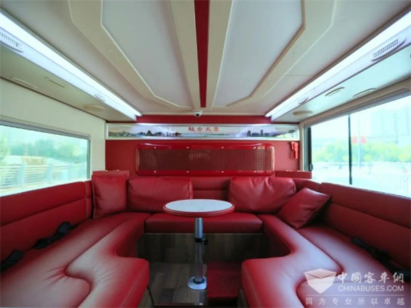 在内部空间设计上,E12S同样匠心独运,精准回应乘客多元需求。一层空间特设公交主题文创展柜,荟萃承载太原城市记忆的特色文创,让地域文化在方寸之间绽放独特魅力;二层采用卡座式散座布局,搭配高档真皮座椅,营造出惬意舒适观景氛围。