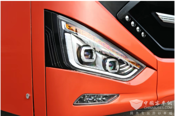 前脸造型延续了中通N系列公交车经典的家族式设计,V字型前脸动感十足,大尺寸的黑色面板与一层挡风玻璃相连,提升了整车高级感。面板中间一条镀铬饰条横穿中通客车Logo,拉伸了横向视觉效果。两侧还各点缀了4颗“星星”,这也是中通N系列公交车标志性的点睛之笔。整个前脸颇有些京剧脸谱的神韵,极具中国风,出口车型也将国潮设计推向海外。