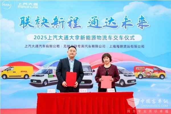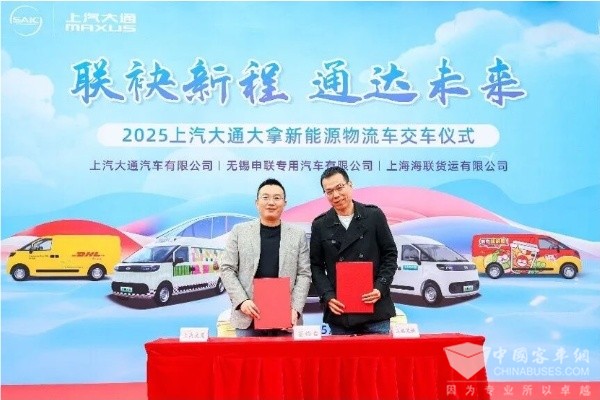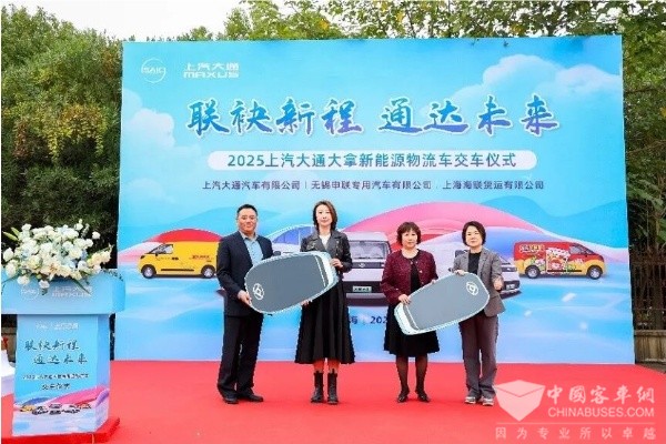 2025年11月11日,上汽大通与上海市道路运输行业协会举办大拿新能源物流车交车仪式,双方携手共计150台的战略订单合作,其中首批50台大拿V1在现场顺利交付,这也是上海货运出租行业新能源车更新的首批车辆;与此同时,上汽大通、铃驹生态分别与上海市道路运输行业协会正式签署战略合作协议。作为“全球轻型商用车领导者”与道路运输行业权威机构深度协作的成果,此举将推动上海货运出租行业的新能源更新进程,更将通过铃驹生态的全链路支持,为城市物流降本增效、绿色减排提供可复制的“大通方案”。