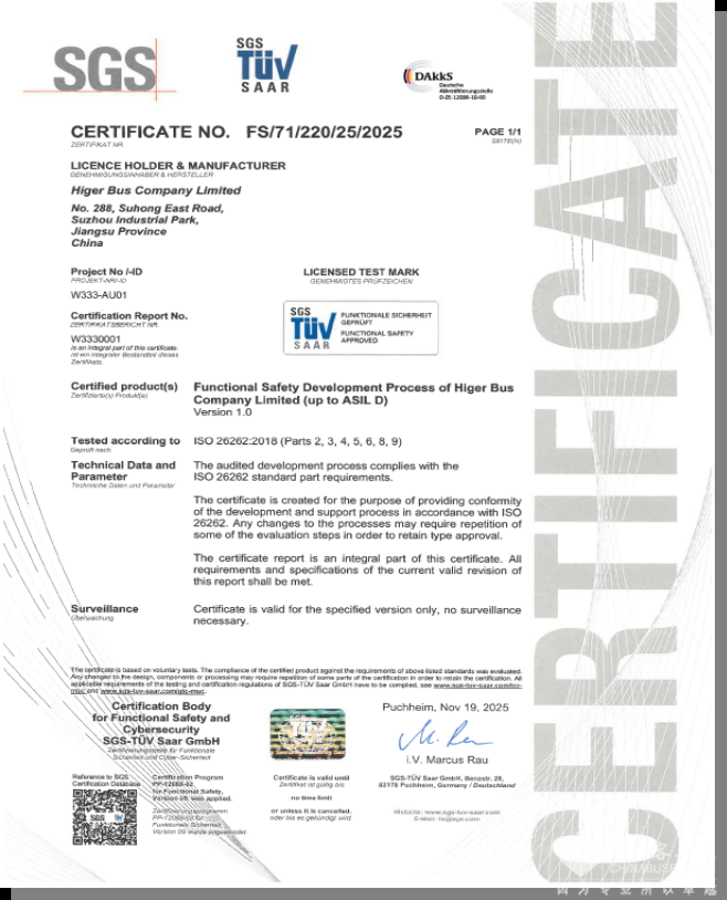 完美作业网有免费视频2025年12月17日获悉,苏州金龙正式通过权威认证,获颁ISO 26262:2018道路车辆功能安全标准最高等级——ASIL D流程认证证书。此次认证标志着苏州金龙已严格按照ISO 26262:2018国际标准,建立起符合功能安全最高等级“ASIL D”要求的完整产品开发与管理流程体系,为公司未来功能安全产品的研发与认证奠定了坚实基础。