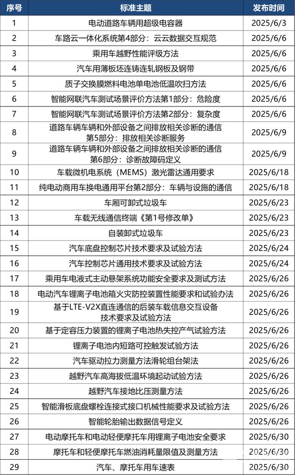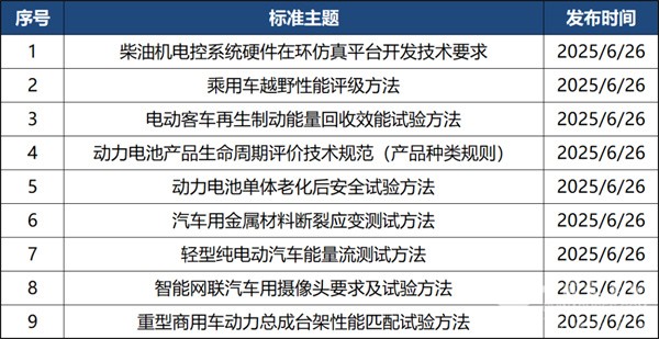2025年6月共有定稿发布标准9部,涉及电池、商用车、材料、智能网联等方面。详情如下: