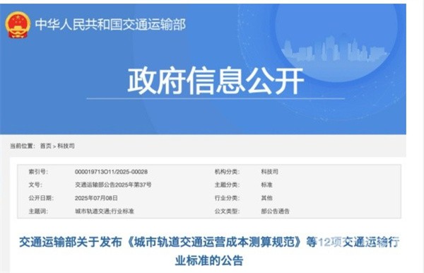 2025年7月8日,交通运输部关于发布《城市轨道交通运营成本测算规范》等12项交通运输行业标准的公告。