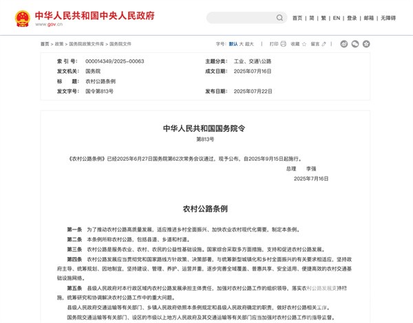 2025年7月16日,国务院发布《农村公路条例》。规定2025年9月15日起,《农村公路条例》将正式实施。《条例》明确,将加大对农村公路超限运输行为的治理力度,防止超限运输车辆违法在农村公路上行驶;加快农村货运物流等相关基础设施建设,保障农村客运可持续运营,促进农村客运、货运物流、邮政快递融合发展,拓展农村公路服务功能,提升农村公路服务畅通城乡经济循环的能力。
