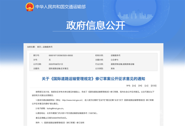 2025年8月下旬,交通运输部发布《关于<国际道路运输管理规定>修订草案公开征求意见的通知》。草案对总则、客运管理、货运管理、共同规定、行车许可证管理、边境口岸汽车出入境运输检查、监督检查、法律责任等部分进行了修订。