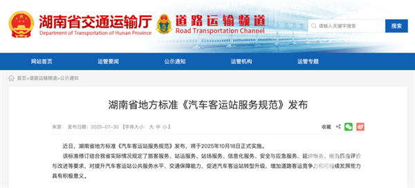 三、湖南:《汽车客运站服务规范》发布