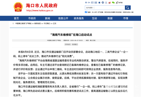 2025年8月,“海南汽车维修码”在海口启动试点,车主可通过该平台查询附近已备案的维修企业,查看在已备案修理厂的维修记录,并进行评价和反馈;企业通过平台申领二维码,车主进店时扫码即可获得企业资质、服务信息等内容。后续,平台还将拓展保险对接、配件溯源等功能,实现消费阳光化、服务便民化、管理规范化目标。