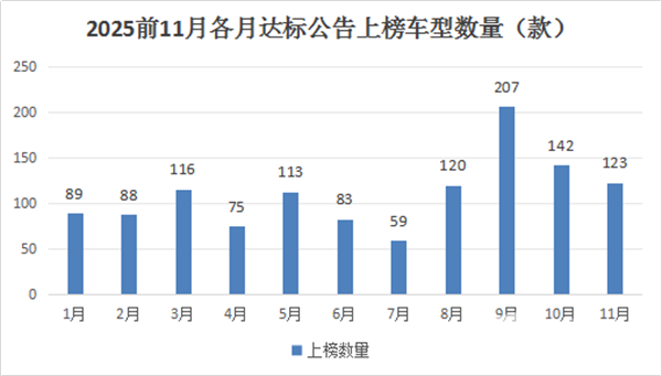 根据交通部数据,2025年1-11月各月(分别依次对应第372批---第382批)公路客车达标车型公告上榜数量统计如下: