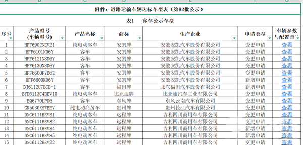 上图可见,在交通部第82批上榜的达标的道路运输客车车型公告中: