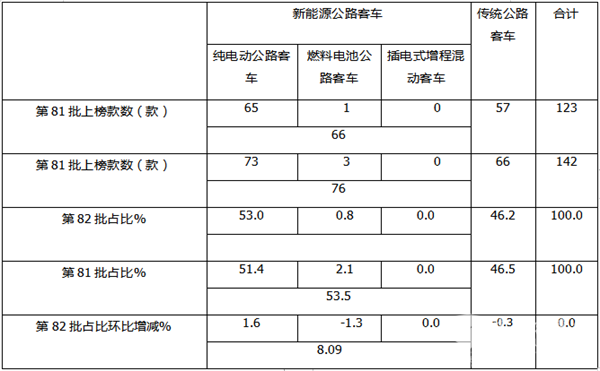 表1,第82批交通部达标车型公告上榜的各动力车型数量、占比与上一批环比(数据来源:交通部)