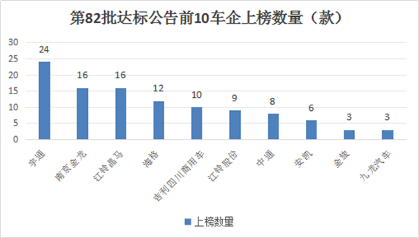 根据统计,本批次上榜的达标客车车型共由18个客车品牌提供,其中上榜数量在3款及以上的有10个企业统计如下图(数据来源:交通部第82批达标车型公告)