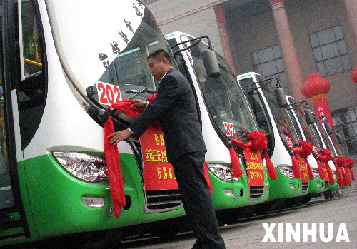 11月11日,一位工作人员在邯郸市博物馆广场装饰即将投入运营的新型节能环保公交车。 当日,河北省邯郸市公交总公司新引进的180辆新型节能环保公交车正式投入使用。据悉,这批节能环保公交车采用双燃料装置,投入使用后将有效减少公交车尾气对城市空气的污染。