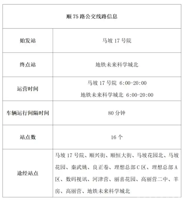 顺75路公交线路由马坡17号院站发车,途经乾安路—白马路—火寺路—顺沙路—高白路—顺于路后,抵达地铁未来科学城北站。