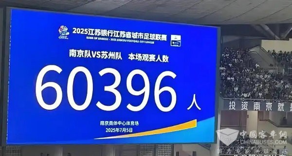 7月5日晚,苏超第六轮“南京VS苏州”在南京奥体中心体育场开赛,由南京队主场迎战苏州队。当晚,南京奥体中心体育场电子大屏显示观赛人数达60396人,创苏超单场人数之最。