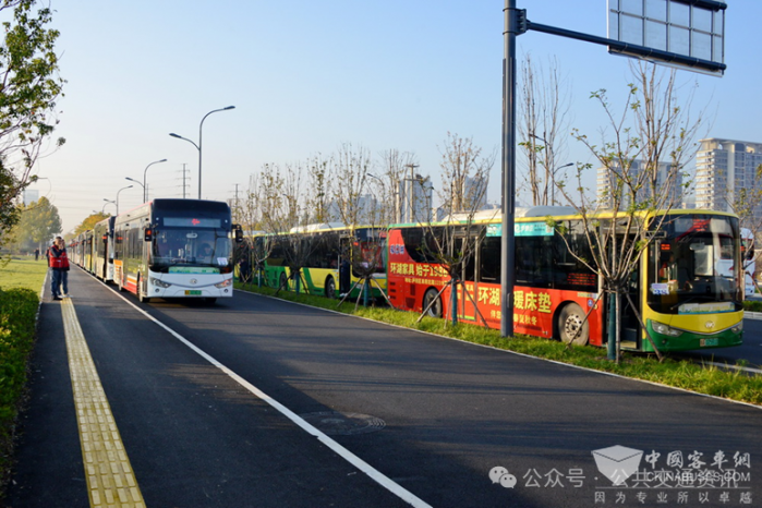 明珠大道公交蓄车区,公交车一字排开准备接驳运送乘客。