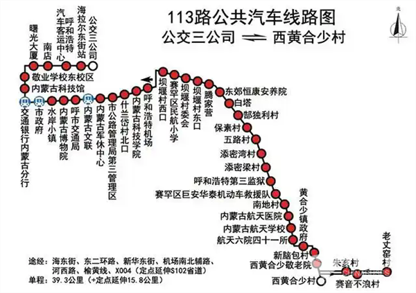 从11月11日起,113路将于每日早晚各一趟,定点延伸至老丈窑村。新延伸的线路共增设3个站点,其中,上行停靠(路南)赛音不浪村;终点站设在老丈窑村(到达时间09:20、17:00左右);下行停靠(路北)朱亥村(到达时间09:30、17:10左右)。