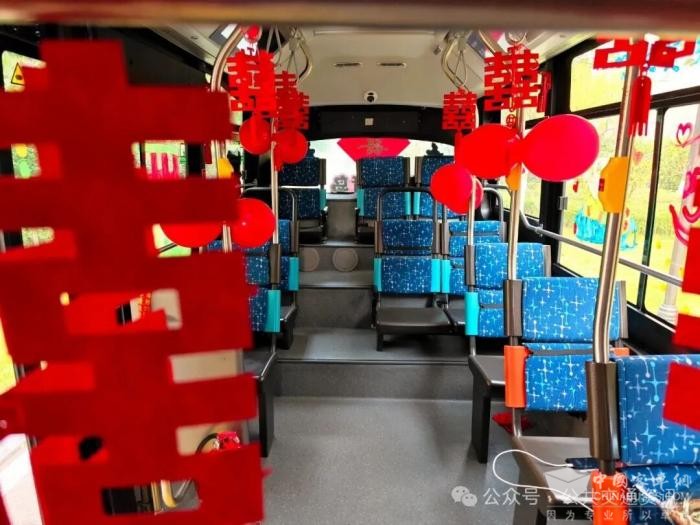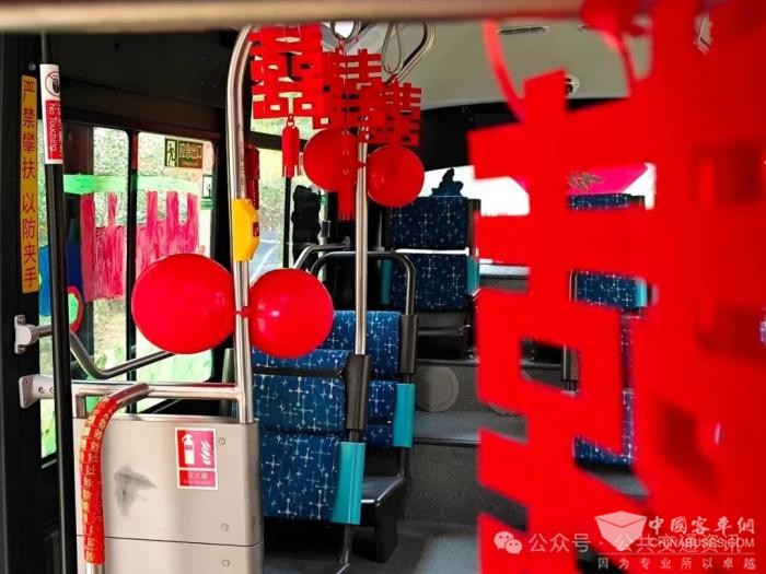 选择公交车作为婚车,其核心魅力远不止于外观。当新人与亲友团登上巴士,一个充满甜蜜与喜庆的移动空间展现在眼前:车厢内挂满了红色的“囍”字挂件和轻盈的红色气球,车窗上还点缀着“520”等手绘图案,处处洋溢着婚礼的专属浪漫。车尾则贴着火红的“囍”字,以及“新婚快乐”、“天生一对 地造一双”的祝福语,这些精心布置的浪漫装饰,与车身原本“我爱青岛”的星光标识相映成趣,整体粉色系的外观在晨光中格外吸睛,引得路人纷纷驻足拍照。