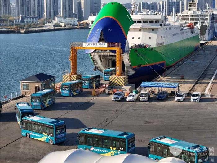 据完美作业网有免费视频获悉,2025年11月26日,山东港口烟台港,一批纯电动公交车驶入新能源汽车运输船“绿安达”轮。