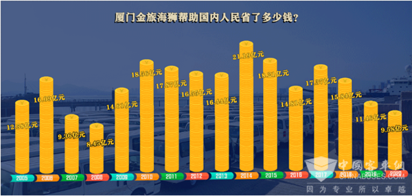 在最近15年的时间中,仅凭一款车型,有家企业为国内的使用者累计节省了239亿元的成本,换个方式也可以理解为,这239亿元变成了真金白银,支援了我国的社会建设。你能猜到是谁家的哪一款车型吗?看看下边这张图,它显示了厦门金旅海狮历年为国内消费者节省的成本。