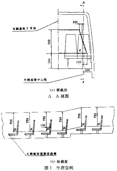 3.3 生存空间是在乘客区内按3.2所述的垂直横截面沿R点的连线移动所扫过的空间。R点的连线是从最后一排座椅的R点,依次经过每排座椅的R点,直到最前排座椅R点的连线,见图1(b)。