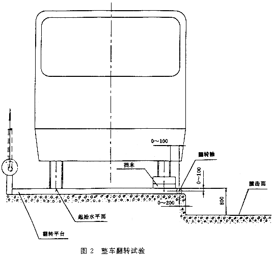 c)翻转轴中心线应位于客车右侧轮胎的外侧,且距最外侧轮胎的外侧面0~100mm;