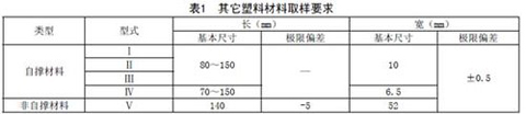 b) 其它塑料材料,试样应按照表1规定取样。对因尺寸太小无法按照规定尺寸制样的产品不做此条要求。试验方法按GB/T 2406的规定执行。