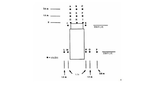 A.2.7 放置圆柱体L、M、N、O和P,使它们的中心位于通过车辆后轴中心线的横向垂直平面上。放置圆柱体L,使它的中心在距离相切于车辆左边最外侧表面(包括后视镜系统)的纵向垂直平面1.8m的纵向垂直平面上。放置圆柱体M,使它的中心在距离相切于车辆左边最外侧表面的纵向垂直平面0.3m的纵向垂直平面上。放置圆柱体N,使它的中心在距离相切于车辆右边最外侧表面的纵向垂直平面0.3m的纵向垂直平面上。放置圆柱体O,使它的中心在距离相切于车辆右边最外侧表面的纵向垂直平面1.8m的纵向垂直平面上。放置圆柱体P,使它的中心在距离相切于车辆右边最外侧表面的纵向垂直平面3.6m的纵向垂直平面上。