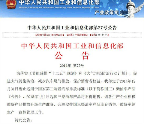 为落实《节能减排“十二五”规划》和《大气污染防治行动计划》,促进大气污染防治,减少汽车尾气排放,保护消费者权益,中华人民共和国工业和信息化部于4月14日发布公告,定于2014年12月31日废止适用于国家第三阶段汽车排放标准(以下简称国三)柴油车产品《公告》,2015年1月1日起国三柴油车产品将不得销售。请各生产企业积极做好产品排放升级生产准备,合理安排国三柴油车产品库存销售,做好车辆生产一致性管理工作。