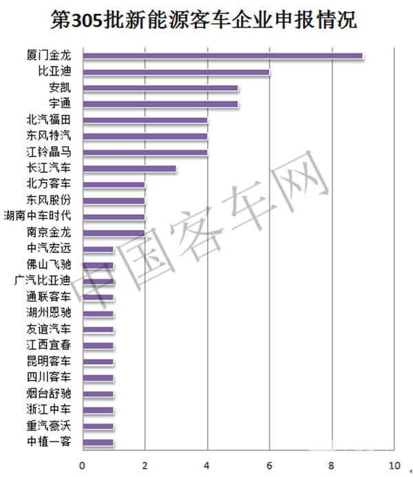 共有25家企业申报了新能源客车产品。其中,厦门金龙申报车型最多,为9款;比亚迪申报6+1款(含广汽比亚迪1款),位列第二;宇通客车和安凯客车均申报5款,并列第三;北汽福田、东风特汽、江铃晶马均申报了4款,并列第四。