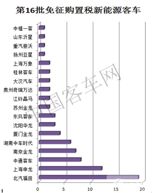 纯电动客车中,北汽福田13款,大汉汽车2款,东风客车3款,桂林客车2款,湖南中车时代6款,江铃晶马2款,苏州金龙2款,南京金龙7款,贵州奇瑞万达2款,厦门金龙4款,山东沂星1款,上海申龙12款,上海万象2款,沈阳华龙3款,扬州亚星1款,重汽豪沃1款,中通客车8款,中植一客成都公司1款。