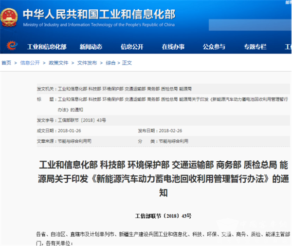 春节假期结束后的第一个周末,2018年2月26日,工信部、科技部、环保部、交通部、商务部、质监总局、国家能源局七部委共同发布《新能源汽车动力蓄电池回收利用管理暂行办法》。