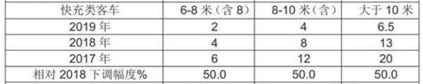 整体分析,2019年新能源补贴相对2018年下调幅度较大,范围在49.33%~ 55.55%之间。其中,8-10米插电混合动力客车降幅最大,降幅达到55.55%。快充类客车各长度段下调幅度均为50%。