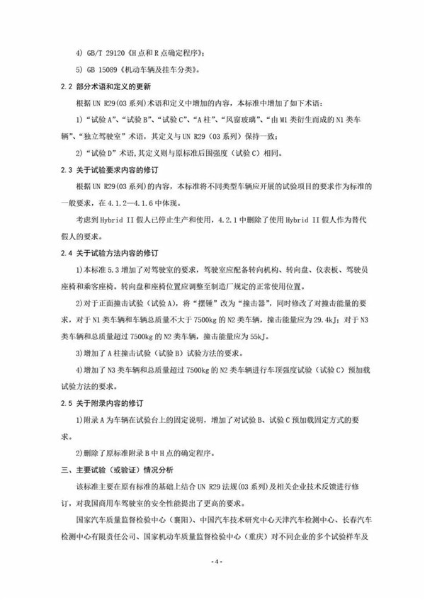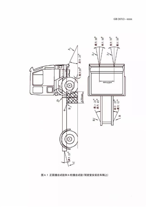 本标准为全文强制,按照GB/T 1.1-2009给出的规则起草。本标准代替GB26512-2011《商用车驾驶室乘员保护》,与GB26512-2011《商用车驾驶室乘员保护》的主要差异有:对于正面撞击试验(试验A),N3类车辆和总质量超过7500kg的N2 类车辆,撞击能量增加为55 kJ;增加 A 柱撞击试验(试验B);在顶部强度试验(试验C)中,N3类车辆和总质量超过7500kg的N2类车辆,增加动态预加载试验—驾驶室侧面摆锤20°撞击试验(P1)。