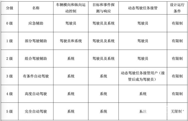 《汽车驾驶自动化分级》(报批稿)中提到,基于驾驶自动化系统能够执行动态驾驶任务的程度,根据在执行动态驾驶任务中的角色分配以及有无设计运行条件限制,将驾驶自动化分成0-5级。与美国的分级标准对比,中国的自动驾驶分级与SAE划分的等级基本一致。