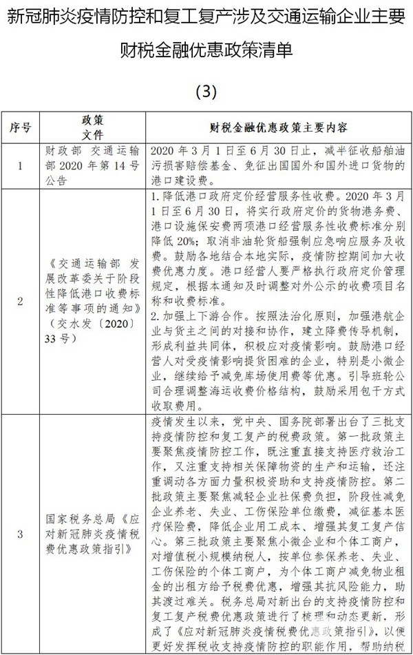 2020年3月13日,交通运输部发布了《新冠肺炎疫情防控和复工复产涉及交通运输企业主要财税金融优惠政策目录清单》(第三期 截至3月13日)。