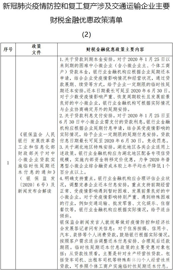 新冠肺炎疫情防控和复工复产涉及交通运输企业主要财税金融优惠政策目录清单