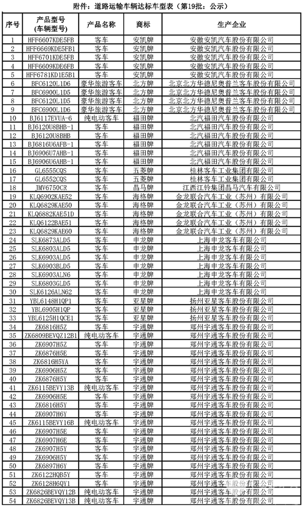 道路运输车辆达标车型表(第19批)公示