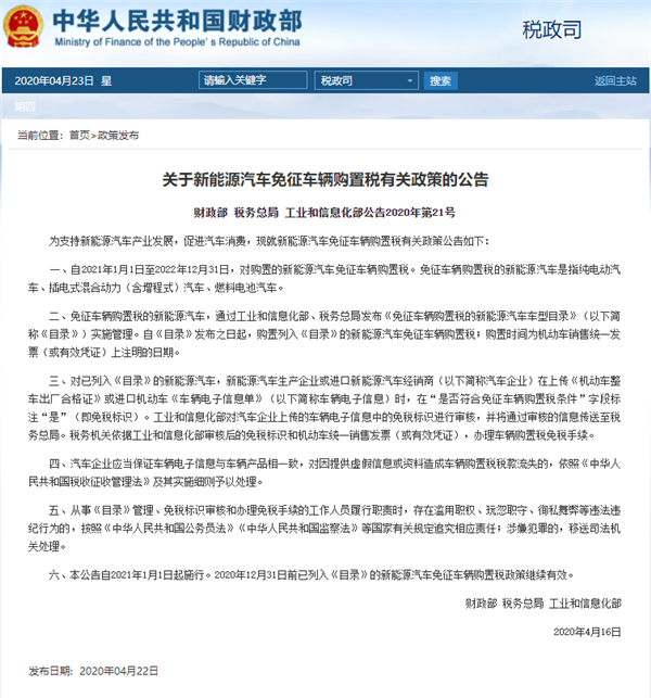 2020年4月22日,财政部、工信部、税务总局联合发布公告称,自2021年1月1日至2022年12月31日,对购置的新能源汽车免征车辆购置税。免征车辆购置税的新能源汽车是指纯电动汽车、插电式混合动力(含增程式)汽车、燃料电池汽车。