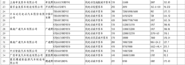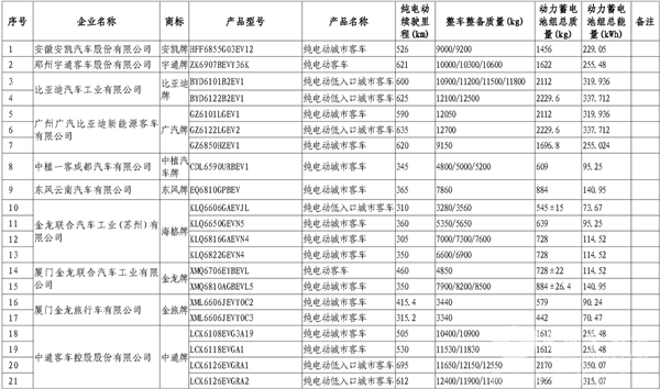 其中天然气客车1款,品牌为申龙牌。 纯电动客车35款,包括广通牌6款,海格牌和中通牌各4款,中国中车牌和和广汽牌各3款,比亚迪牌、金龙牌、金旅牌各2款以及安凯牌、宇通牌、中植牌、东风牌、申龙牌、开沃牌、广客牌、紫象牌、穗通牌各一款。插电式混合动力客车4款、燃料电池客车1款,品牌全部为福田牌。
