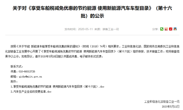 2020年5月11日,工业和信息化部税务总局联合公告了《享受车船税减免优惠的节约能源 使用新能源汽车车型目录》(第十六批)的公示,本批次共计列入224款新能源车型。